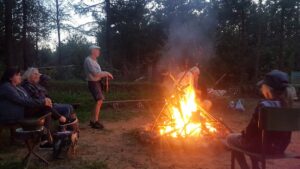 Pod jej kierunkiem oczyściliśmy palenisko i ułożyliśmy podpałkę naturalną oraz chrust. We czworo zapaliliśmy ognisko od wszystkich stron świata. Uczestnicy, w wieku od 2 lat do ok. 70, zostali obdarzeni oczyszczającymi dżwiękami i wibracjami mis tybetańskich (przez Regninę) oraz bębna szamańskiego (przez Pawła).